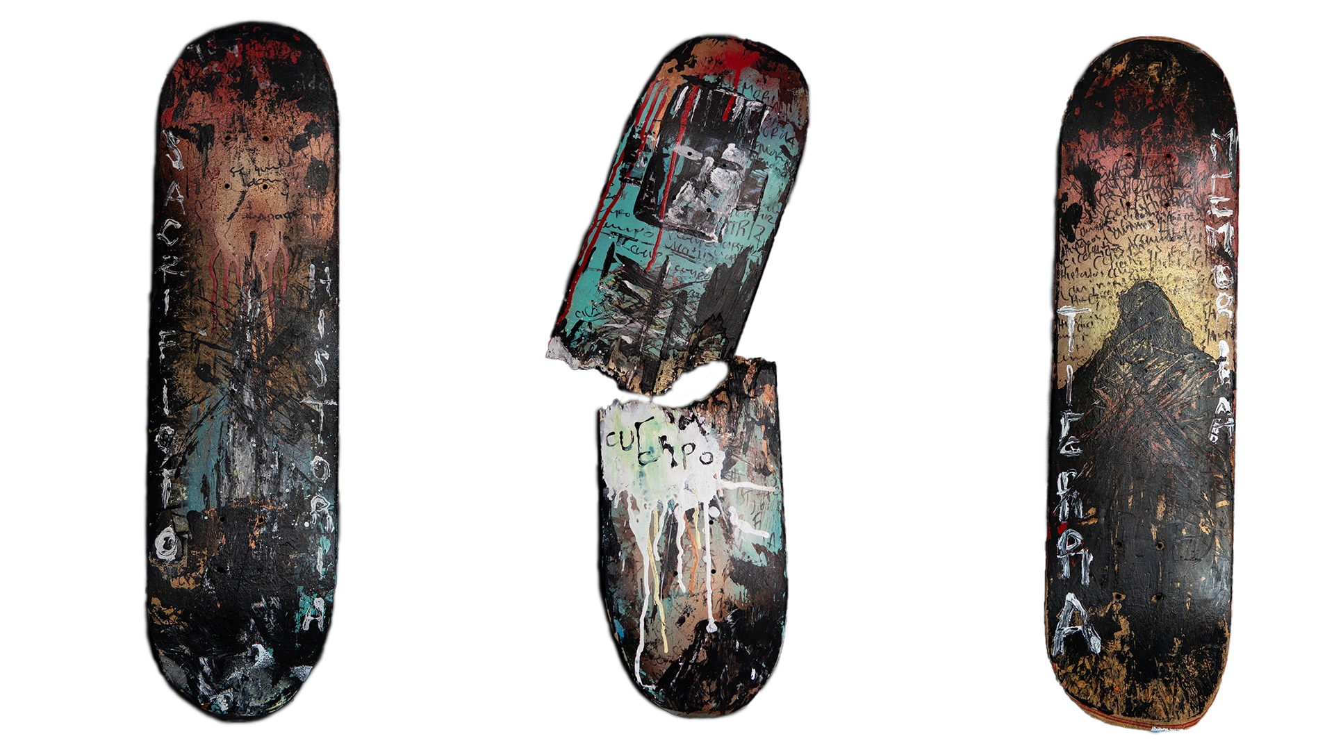 Este tríptico busca visibilizar estas capas de sacrificio y memoria. Cada tabla de patineta se convierte en un fragmento